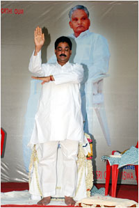 The physical appearance of Sri Sri Sri Guru ViswaSphoorthi in public is a very rare occurrence. But He interacts with people at different places regularly using an unknown, unique divine process that is referred to as 'Medium'. Using this method Guruji interacts with people at different places at the same time not through His physical body but by using the bodies of different persons. These persons are known as mediums. Sri Sri Sri Guru Viswa Sphoorthi chooses some persons, enters their body and interacts with people who come to see Him. This is a regular practice being done at various spiritual centers of Sri Sri Sri Guru ViswaSphoorthi called Dhyana(Mano)Prasthans. During the time of Guruji's influence on the medium, the medium temporarily loses his Memory, Consciousness and Behavior.